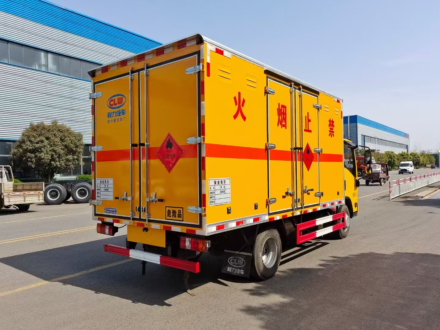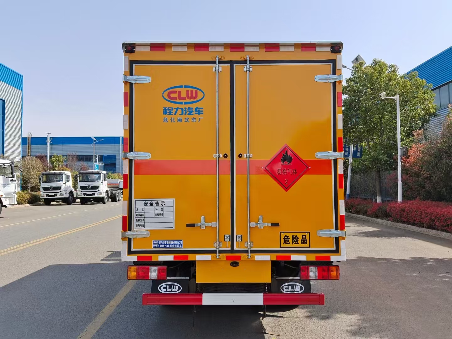 貨箱配置 廂體為雙層金屬骨架結構,外板采用冷軋鋼板,中間填充阻燃泡沫,內飾為鋁板。底板為平板上鋪防靜電膠皮。廂內兩側加裝固定貨物臥環,門框帶防盜報警器,頂部帶煙霧報警器,廂體右側選裝側門,隨車配2個滅火器,危險標志牌,防火帽,危險品三角頂燈。 (選裝瓦楞板貨箱) (尾部可選裝液壓升降尾板)